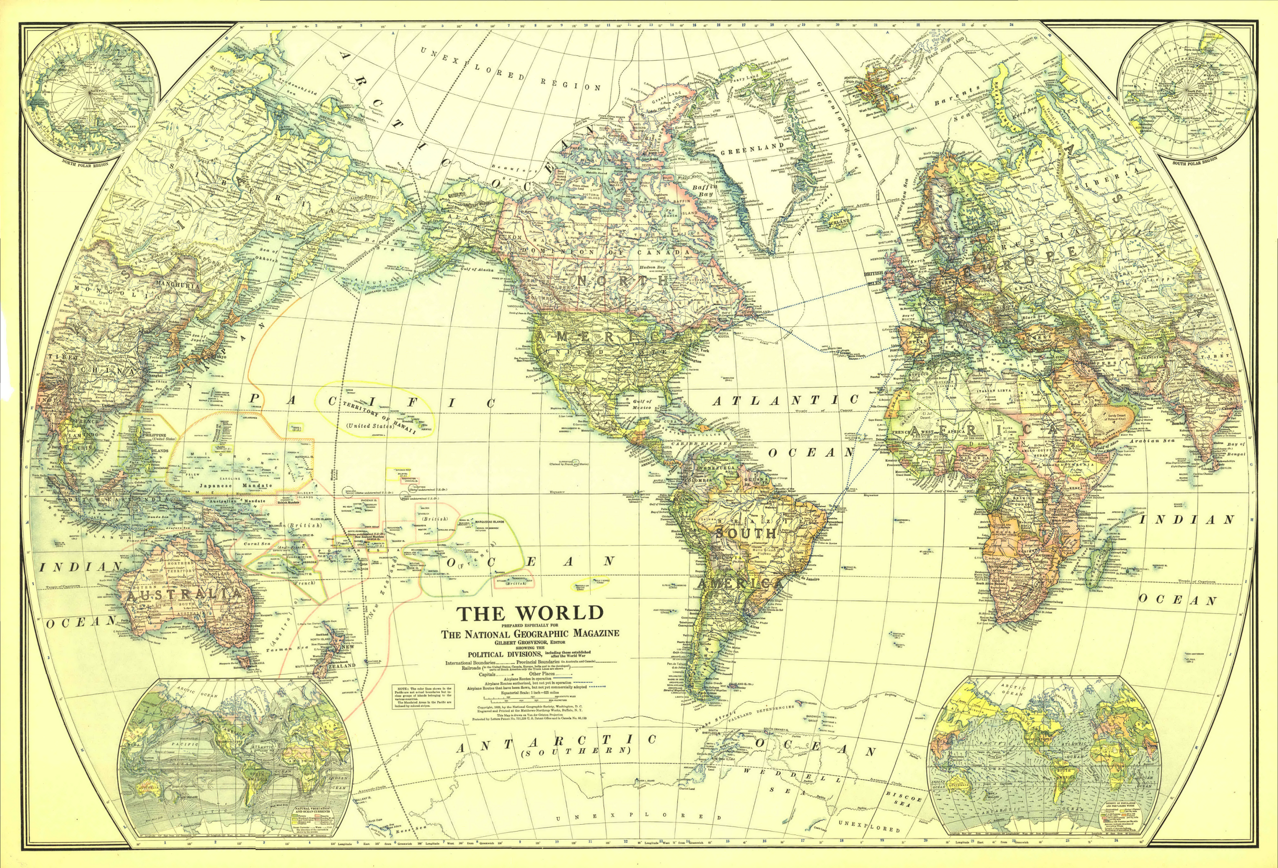 - Extra maps in the corners: North and South polar regions, natural vegetation and ocean currents, density of population and prevailing winds.
