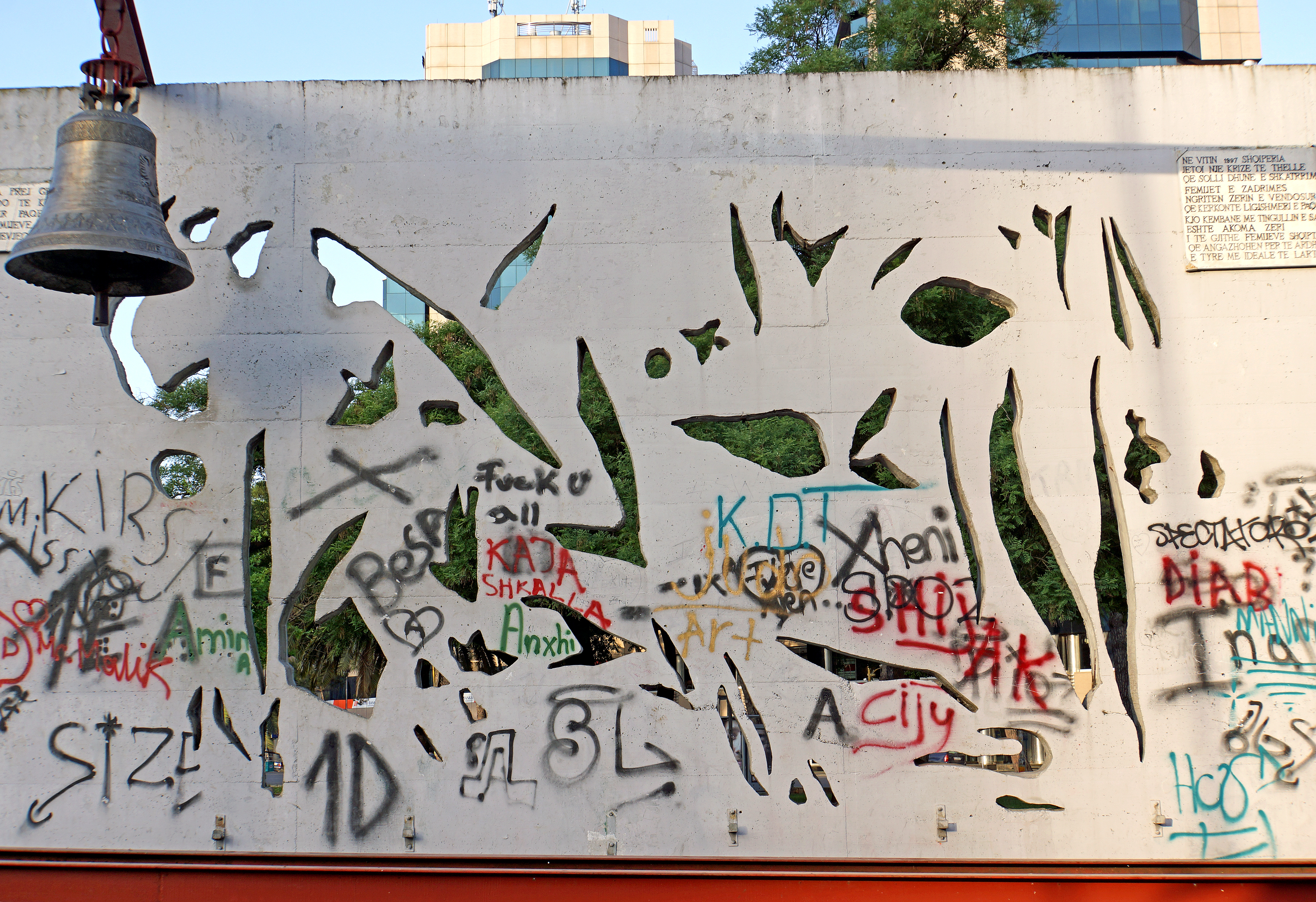 GIGANTICKÁ Fotografie + English: Albania-02608 - Peace Bell (Taken on June 11, 2013, Sony NEX-7) The Peace Bell hangs just a few metres from the entrance of the Enver Hoxha Pyramid. It represents a huge memorial to peace made of the melted metal from 20,000 bullet cartridges, gathered by children in Shkodra in 1997, when the country was threatened by a civil war.