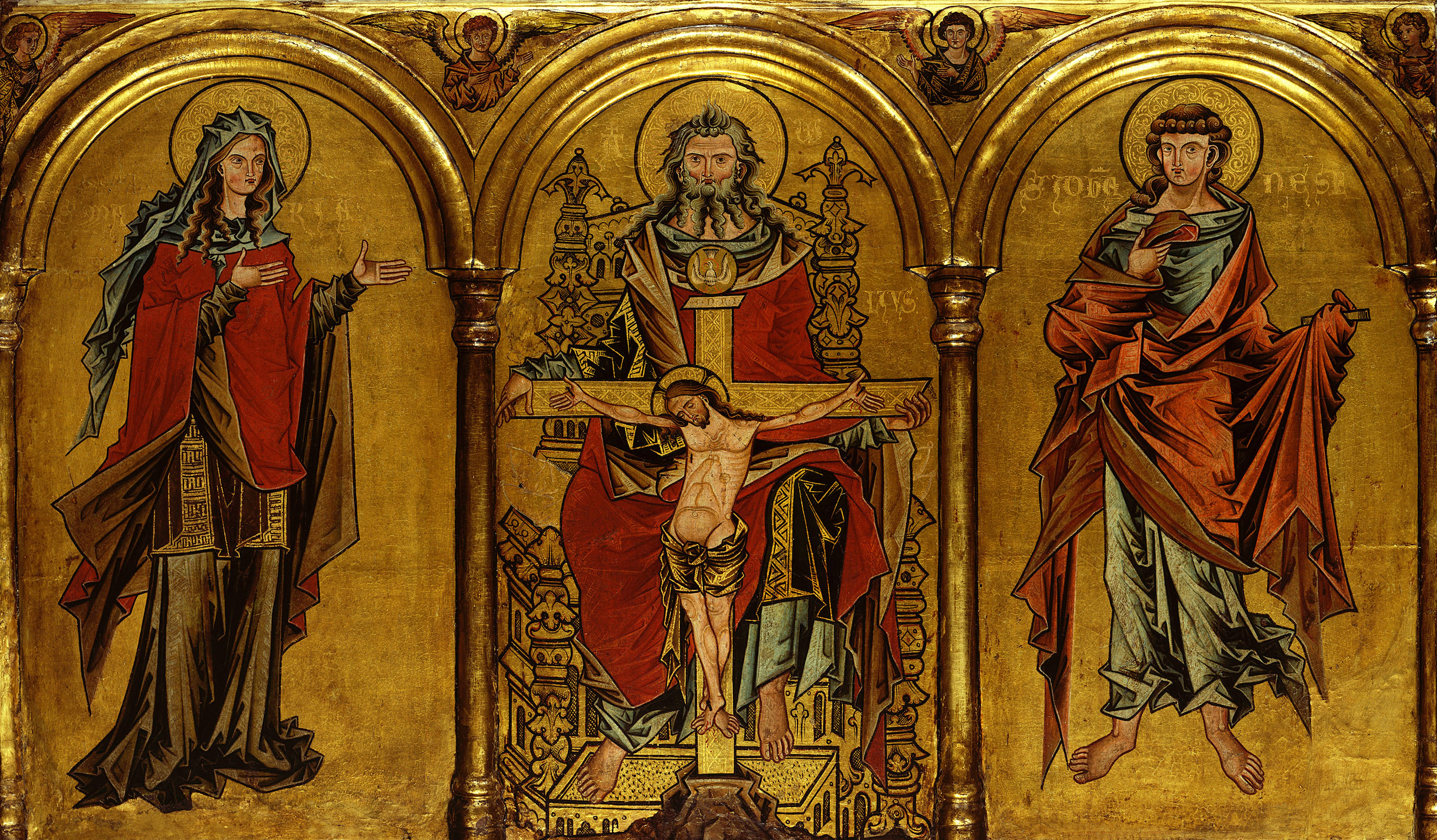 - German: Altarretabel der Wiesenkirche in Soest, Gnadenstuhl mit Maria und Johannes, Gesamtansicht, Szene von links: Maria, Thronender Gottvater mit Kreuz Christi, Hl. Johannes