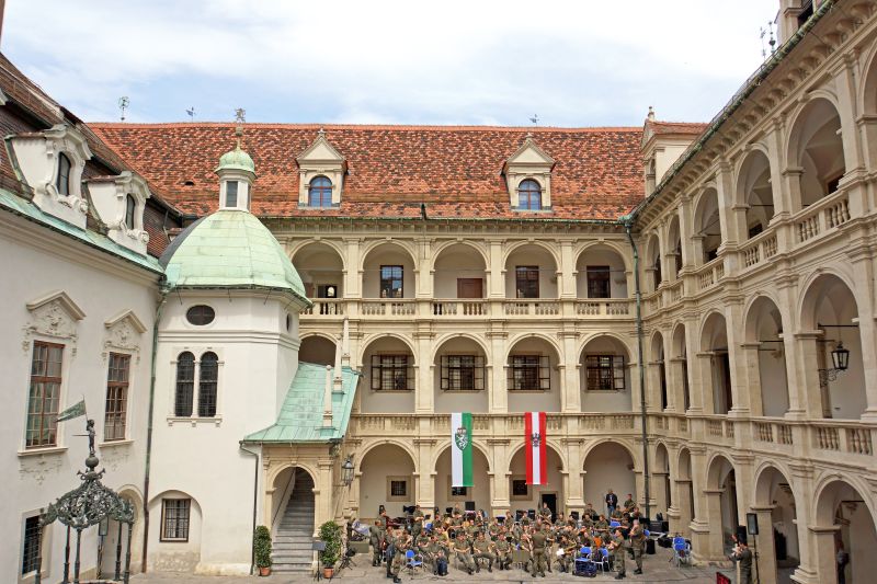 • The Landhaus has been since 1494 the chancellery and meeting place of the Styrian state. Today it is residence to the Styrian parliament. A military band was playing in the courtyard.