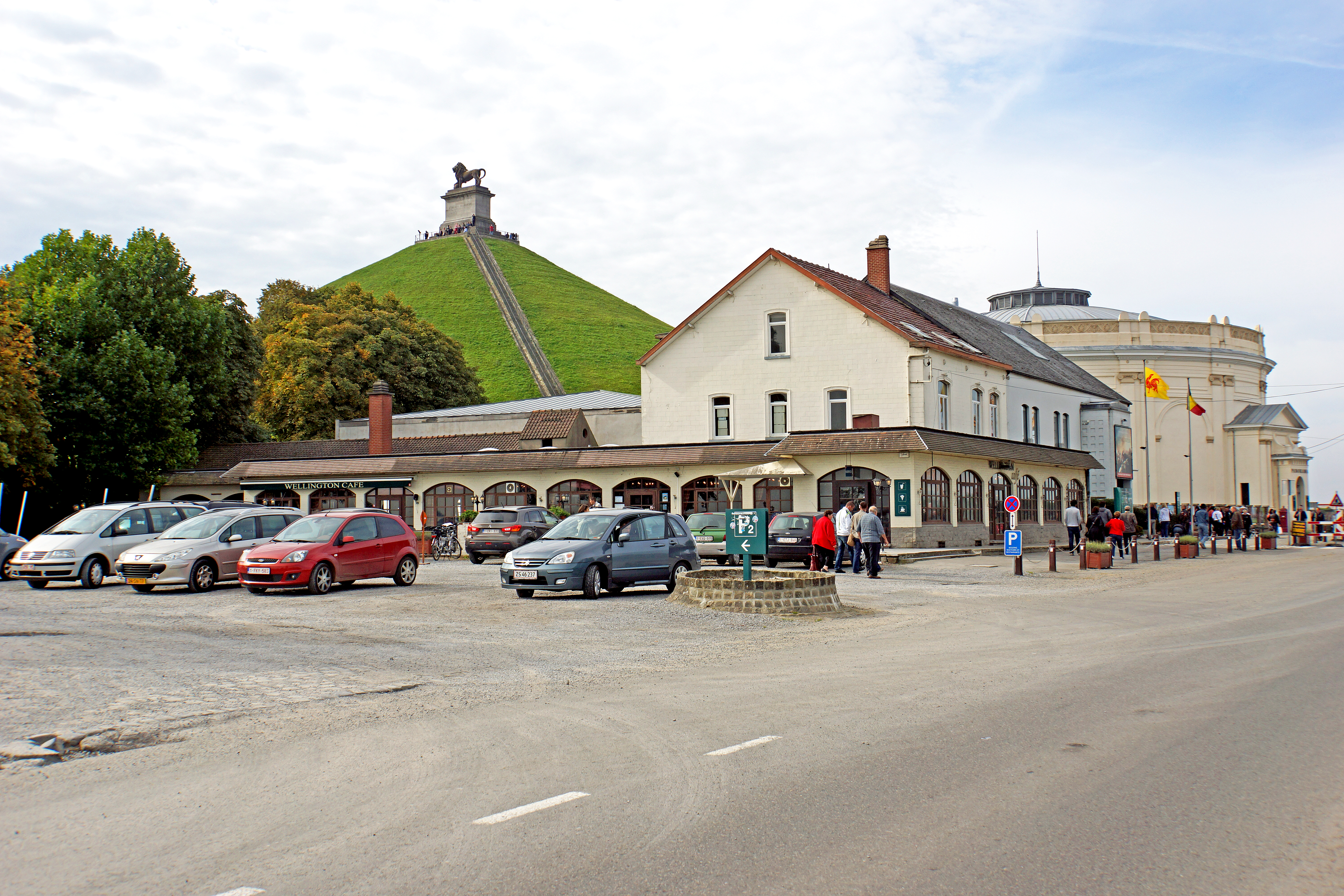 - Waterloo Battlefield - Lion hill, rises above the former battlefield and is visible from afar. It was constructed between 1823 and 1826 on the place where the Prince of Orange received his fatal wounds. The hill was built up with 32,000 cu.m (42,000 cu.yd) of earth from the battlefield to a height of 40 meters (131 ft) and a circumference of 520 meters (1,706 ft) on a supporting brick base. From the platform there is a panoramic view of the battlefield.