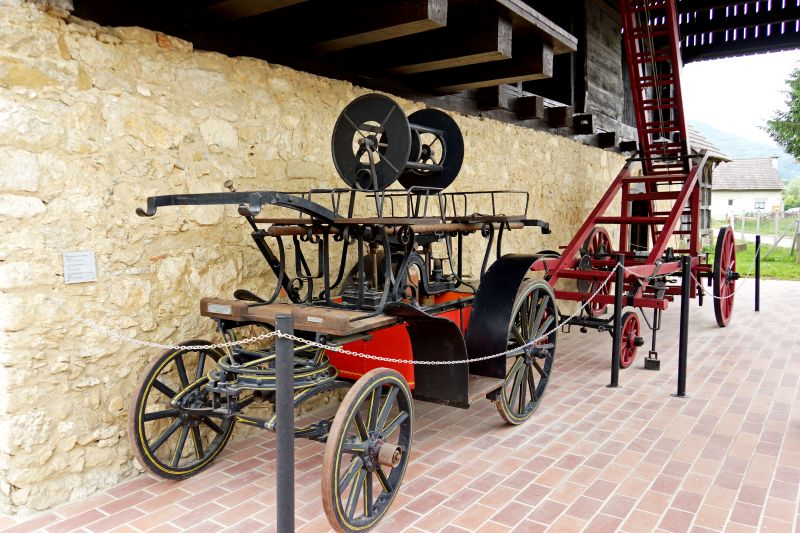 • Firetruck with pump (1889), extension ladder in back.