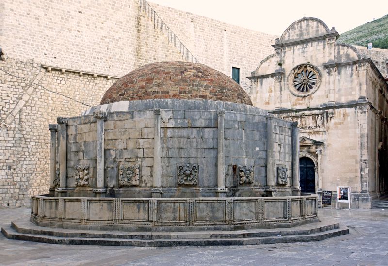 • Built from 1438 to 1440, the Big Onofrio's Fountain is a sixteen-sided container with a cupola, and was one of the ending points of the aqueduct system. Each of the sixteen sides has a unique stone-carved masked face with the faucet projecting out of the mouth. The fountain's cupola was made by Petar Martinov from Milan. However, the fountain was also partly damaged by the earthquake in 1667 hence the current look is missing a dragon statue that had once been on top of the cupola.