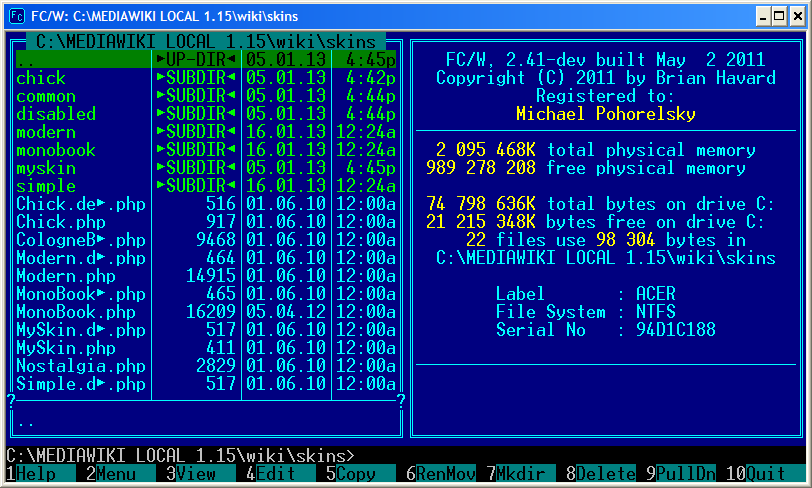 • V levém okně je vidět lokální kopie (kompletní záloha) staré MediaWiki verze 1.15, zřejmě ze starého serveru (Pentium D)