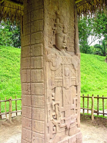 - Stela C is the twin of Monument 1, standing 4m (12 feet) above the surface. It is sculpted with a frontal portrait of Cauac Sky, wearing his headdress and holding a double-headed ceremonial bar horizontally across his chest.