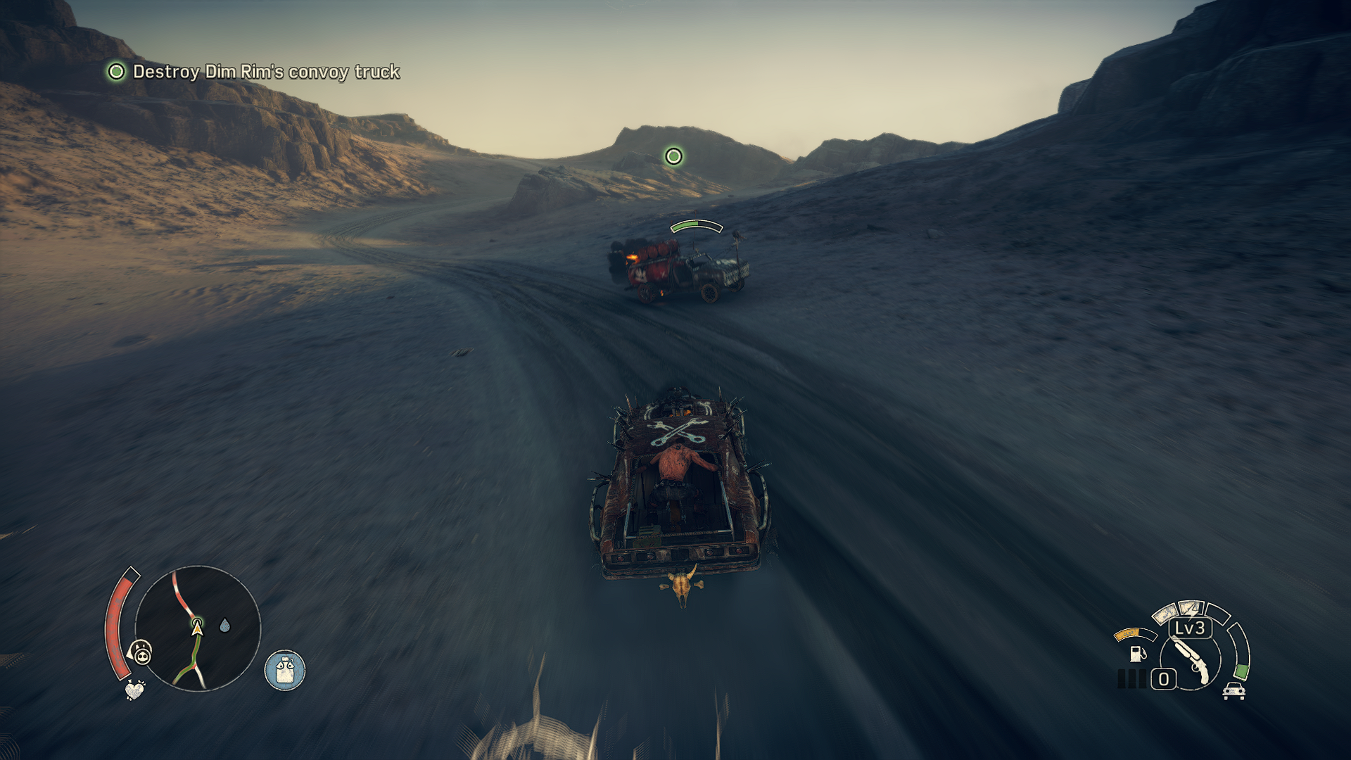 Aktuální snímek počítačové hry + Mad Max (2015, GOG.com) + pochází z mého vlastního počítače.
