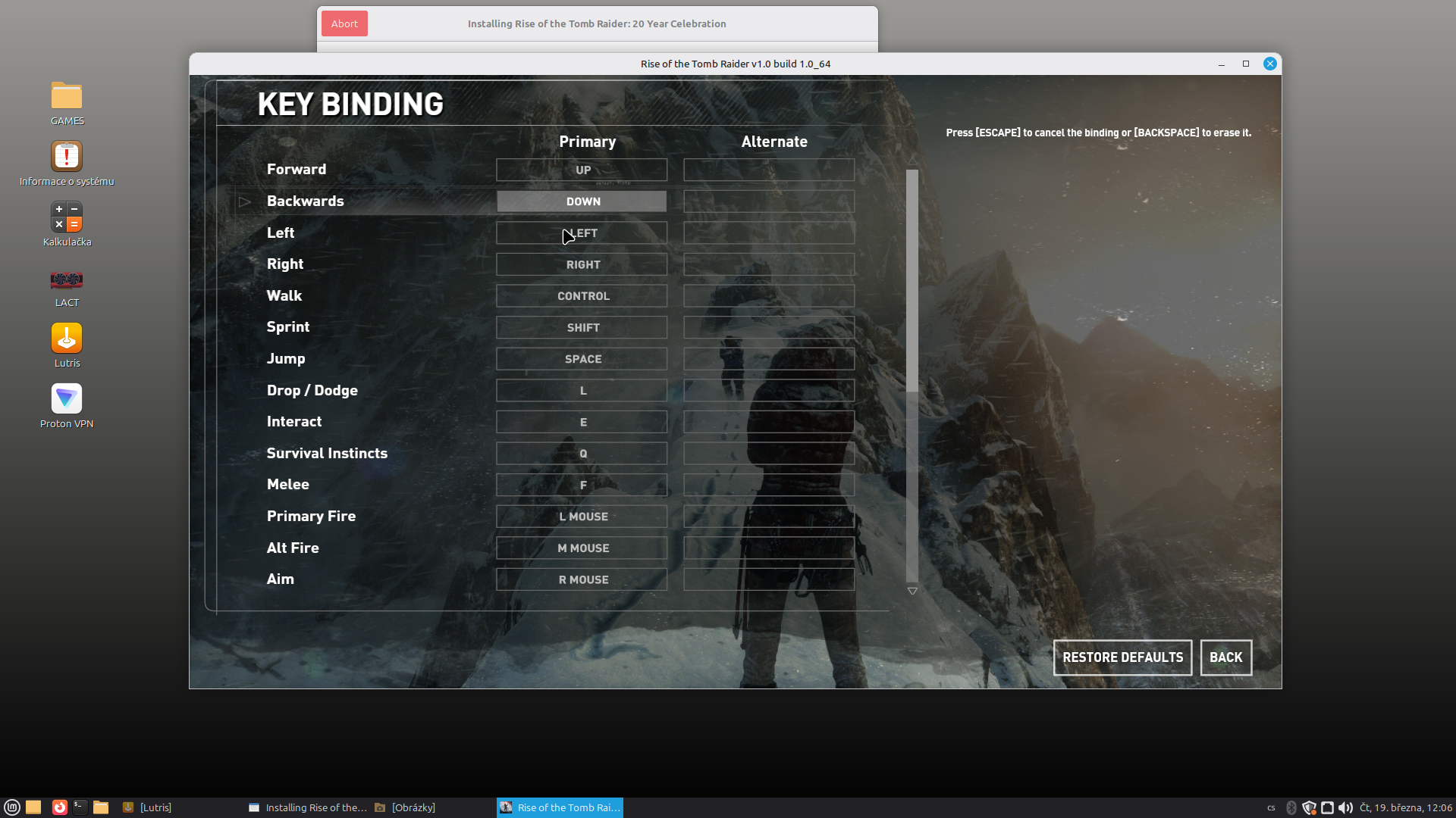 Aktuální snímek počítačové hry + Rise of the Tomb Raider: 20 Year Celebration v Linuxu Mint (GOG.com) + pochází z mého vlastního počítače.
