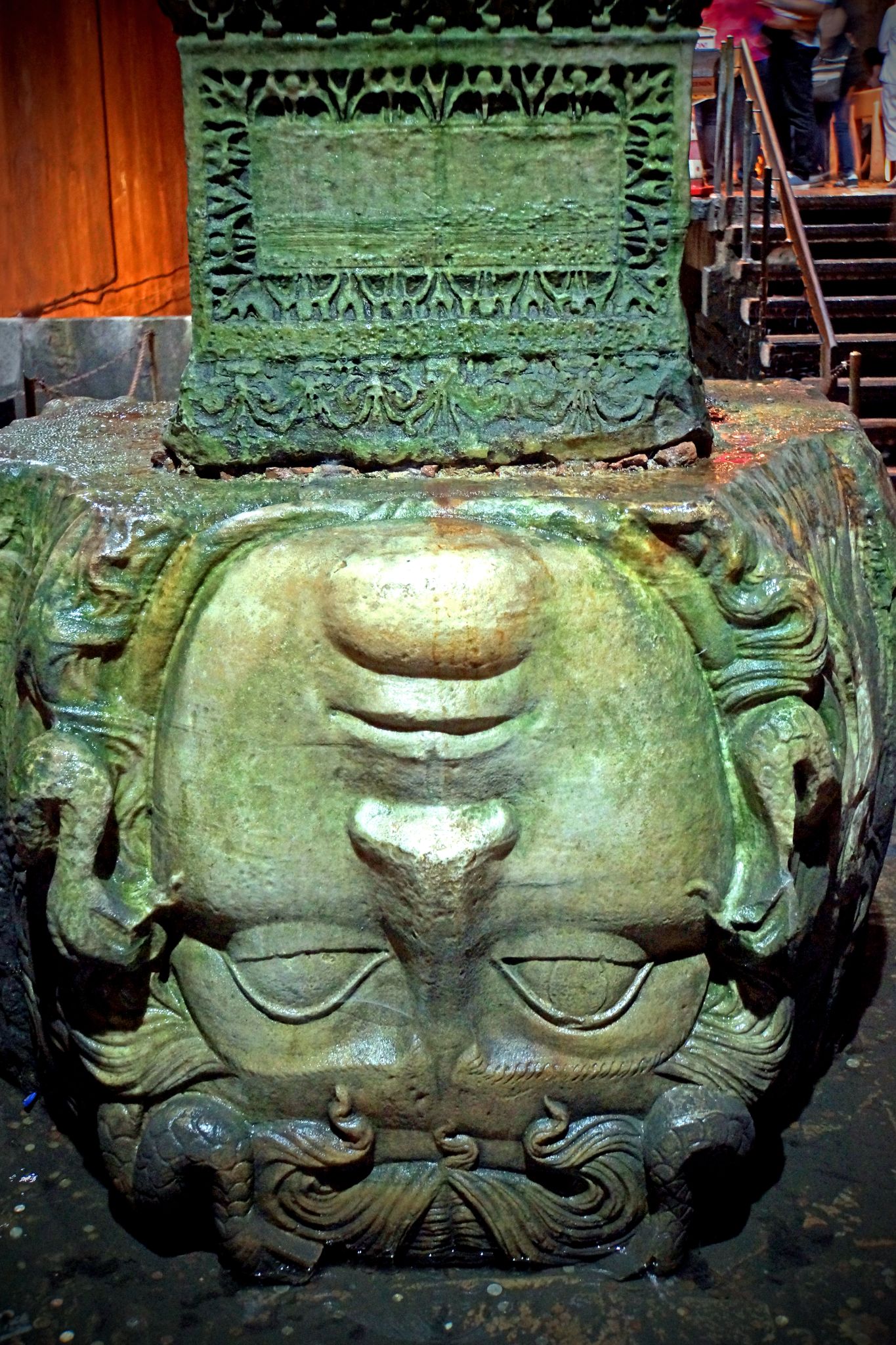 • Located in the northwest corner of the cistern, the bases of two columns of reused blocks carved with the visage of Medusa. The origin of the two heads is unknown, though it is thought that the heads were brought to the cistern after being removed from a building of the late Roman period.